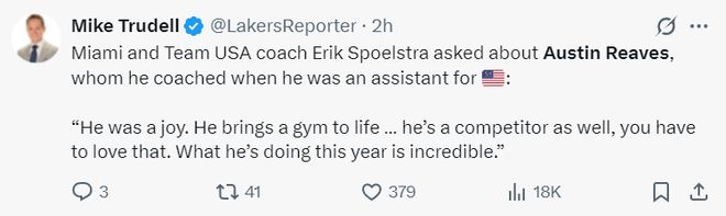 赛前新任美国男篮主帅斯波尔斯特拉谈到里夫斯:我当美国队助教的时就执教过他,他是一个让人感到快乐的家伙,他在健身房丽充满活力,他还是一个竞争者,这一点你不得不佩服,他今年取得的成绩简直令人叹为观止。